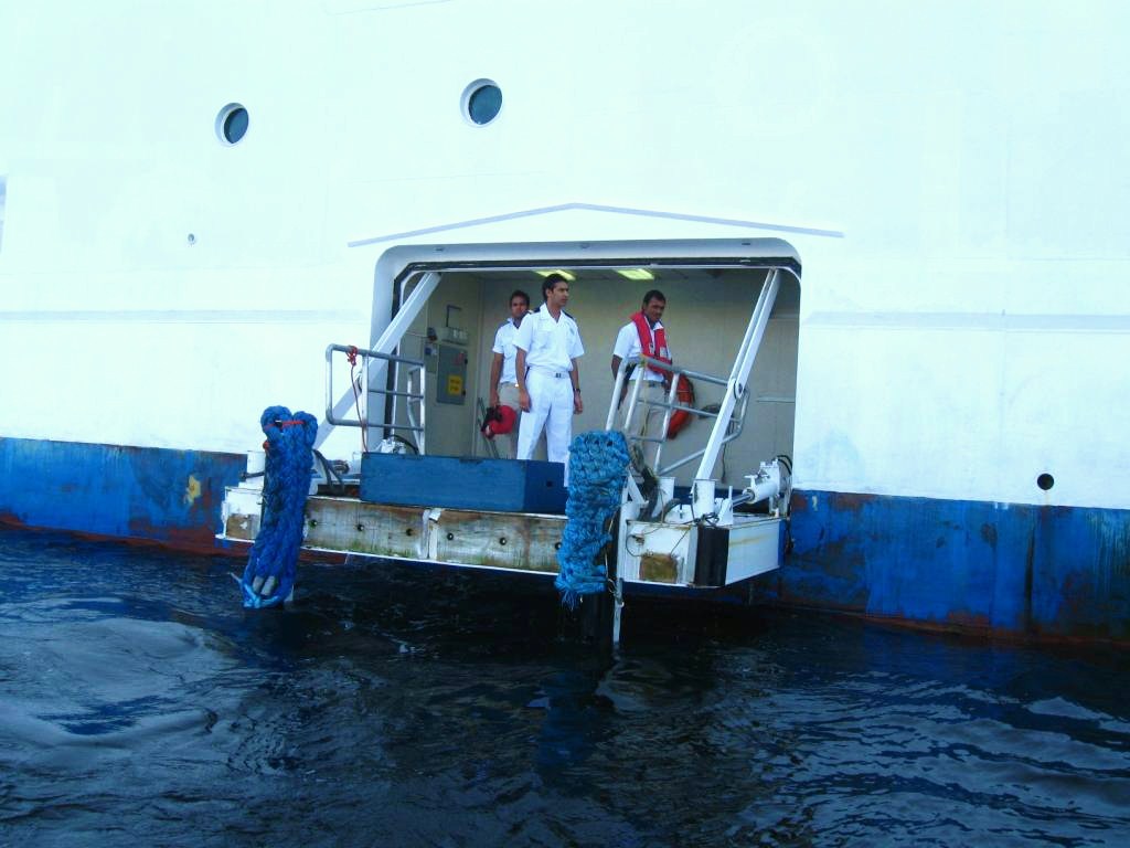 John retrieved them and decided to take them to the boat deck to watch let them watch our departure from Cabo. From their perch directly above the gangway, they watched the last shuttle race to the boat carrying a sparse, reeling cargo of very sunburnt young men. The huge steel hatch dipped under the choppy water, sending a wave of seawater coursing over the shoes of a crewmember, who scampered away. Two crewmembers hauled aboard the wet, heavy bumpers by sheer muscle power. Then, the hydraulics took over and the hatch closed, gliding shut so smoothly that its movement, while rapid, was almost imperceptible.