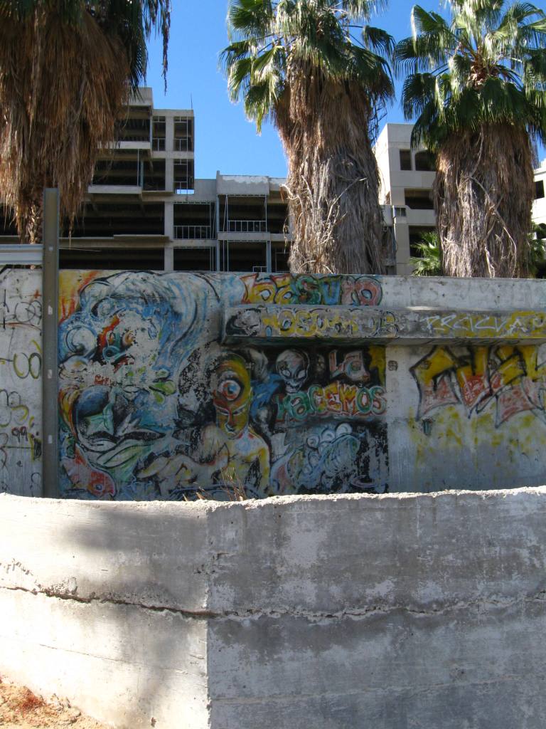 shade of derelict, half-built “luxury resort living” condos. Tagger’s marks