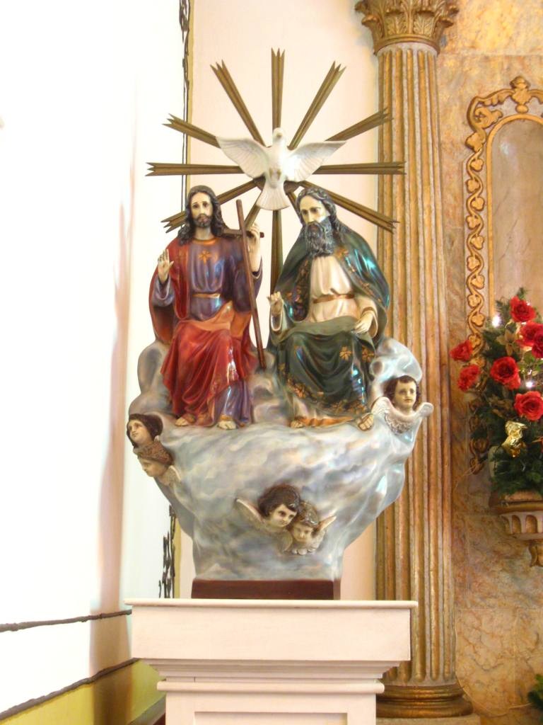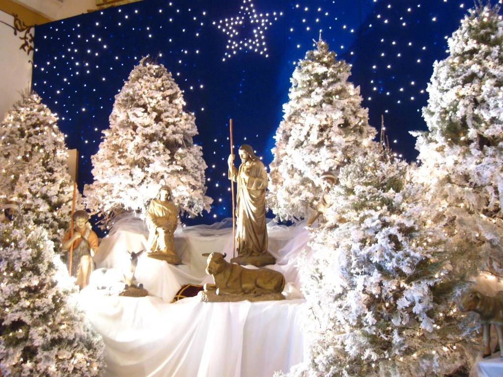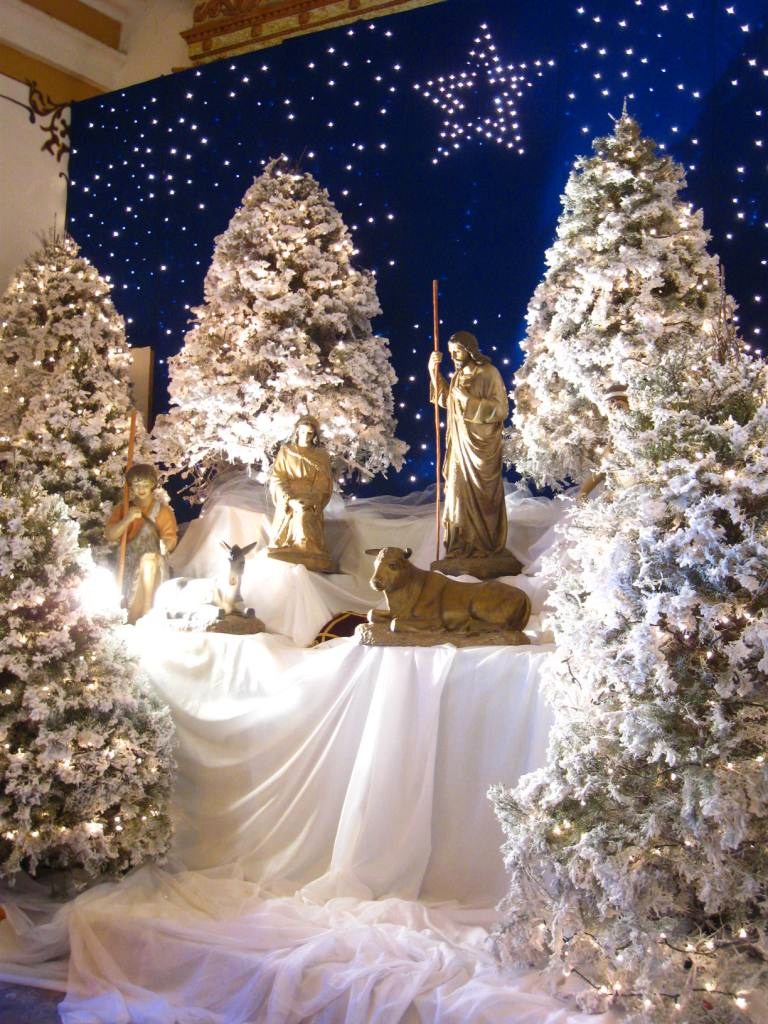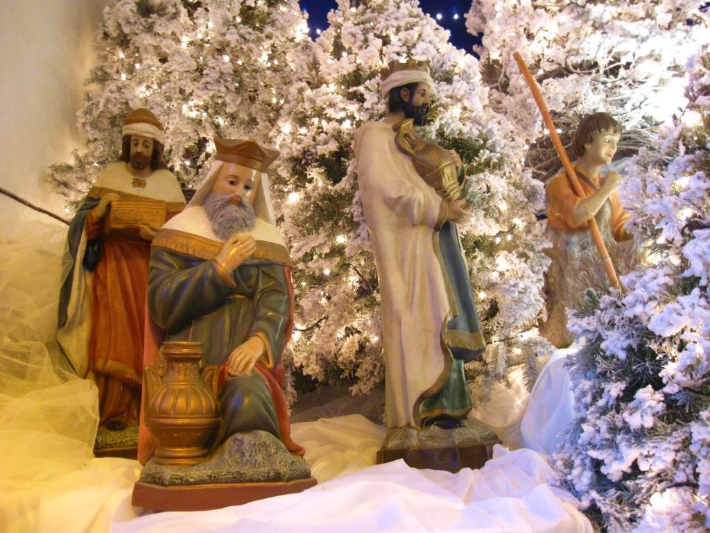 and Christmas lights. A lit nativity scene in the transept showed the three